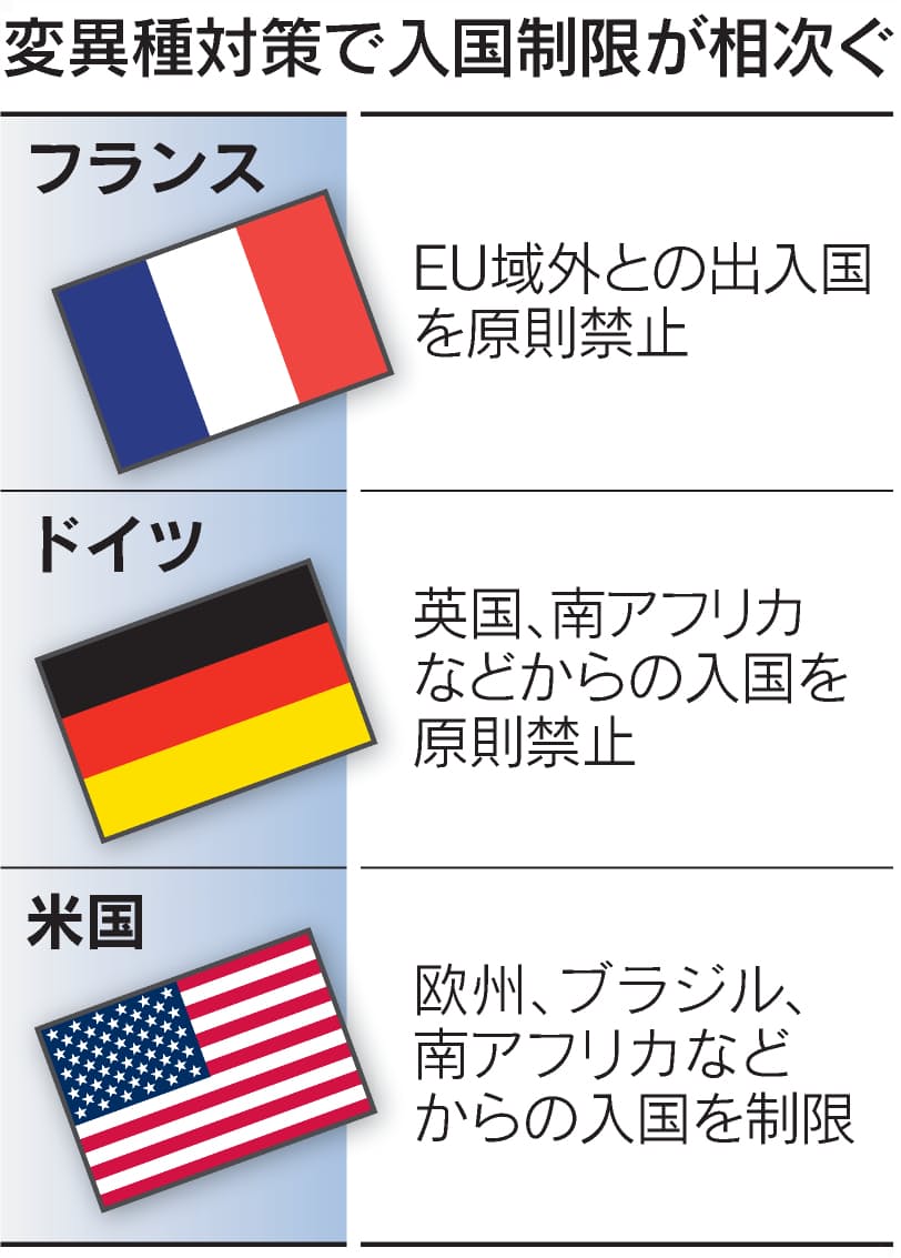 【ベルリン=石川潤】感染力の高い新型コロナウイルスの変異種への警戒が高まるなか、米欧各国が感染拡大地域からの入国禁止などの措置に動き始めた。フランスが29日、欧州連合(EU)域外との出入国を原則禁止としたほか、ドイツも同日、変異種が広がる英国、南アフリカなどからの入国を禁じた。変異種を水際で食い止めるための事実上の国境封鎖が広がりつつある。