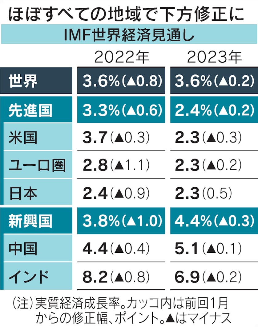 ウクライナの成長率は22年にマイナス35.0%、ロシアも8.5%のマイナス成長となる。日本の予測は2.4%と、0.9ポイント下げた。