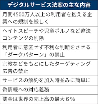 ヘイトスピーチや児童ポルノ、海賊版の販売といった違法コンテンツや商品について、削除を含めた対応を義務付ける。SNS(交流サイト)上の動画に加え、商品販売サイトなどが対象になる。