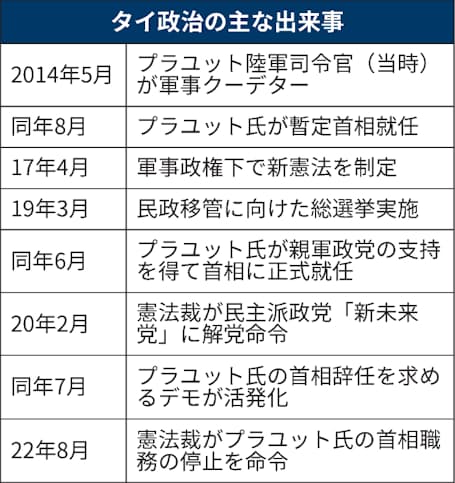 タイは22年のアジア太平洋経済協力会議(APEC)の議長国で、11月にバンコクで首脳会議の開催を予定する。23年3月に下院の任期満了を控えており、憲法の規定では同年5月までに次期総選挙が実施される見込みだった。プラユット氏の職務停止により政情が混乱する可能性がある。