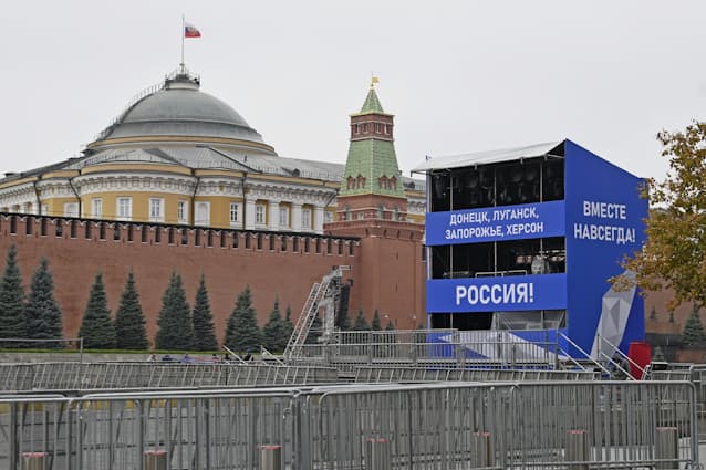 モスクワ中心部の赤の広場周辺では併合を記念する式典の準備が進む。看板には併合予定の4州を指して「ドネツク、ルガンスク、ザポロジエ、ヘルソン」「共にいつまでも」と書かれている。市街地中心部では30日に大規模な交通規制も予定されている。