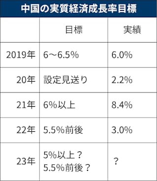 22年の中国経済は「ゼロコロナ」政策などで3%成長にとどまった。同年の政府目標「5.5%前後」を大幅に下回った。長期の景気停滞で企業や家計のマインドは冷え込んだ。政府内には「先行き不安を和らげるうえで政府目標は22年と同じ5.5%前後とすべきだ」との意見もある。